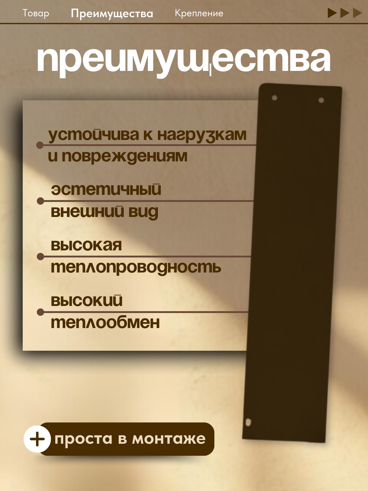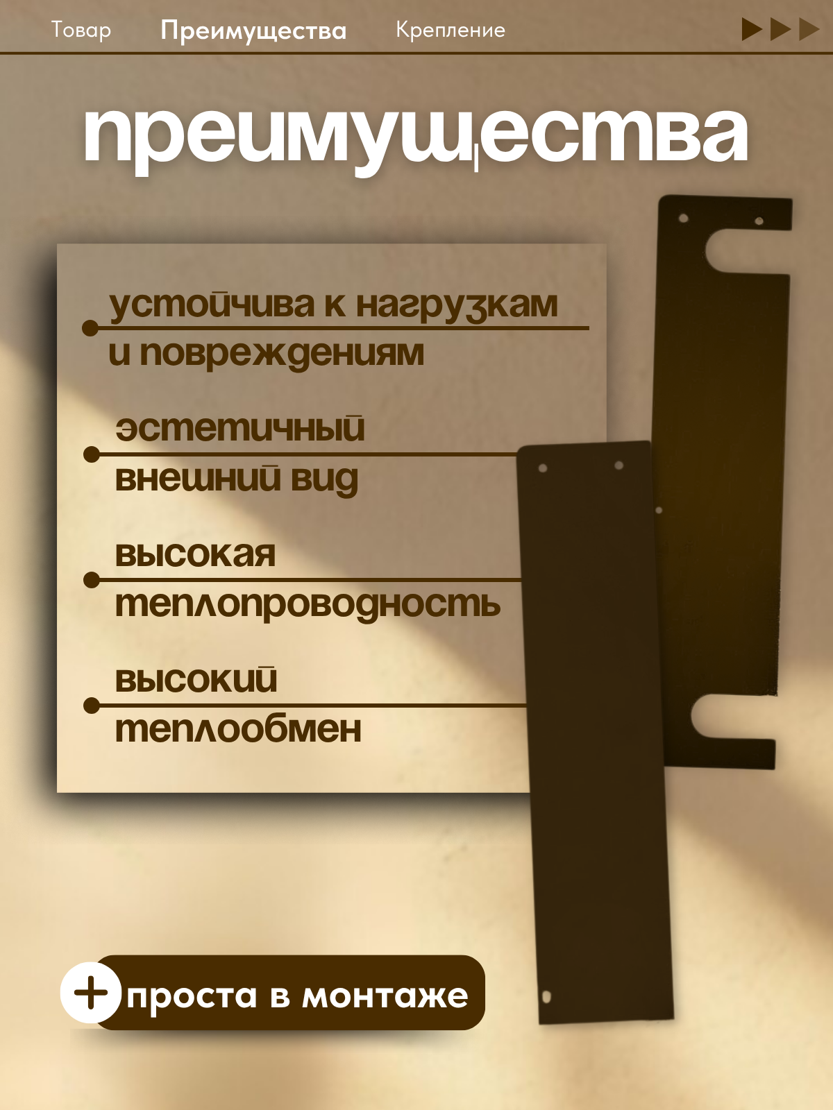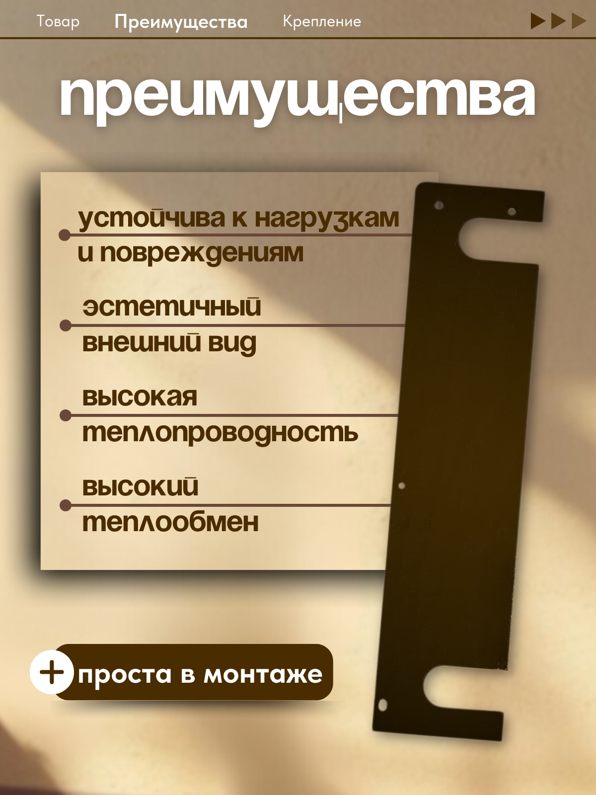 Боковина для сетчатого экрана радиатора устанавливается на чугунные и стальные секционные радиаторы. При использовании улучшает конвекцию воздуха в помещении, благодаря чему комната прогревается быстрее и равномернее. Также является важным элементом интерьера комнаты, декорируя отопительные приборы. Предохраняет от получения термической травмы. Обеспечивает защиту от попадания пыли и загрязнения радиатора.